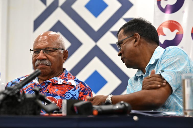 People’s Alliance Party leader Sitiveni Rabuka and National Federation Party leader Biman Prasad hold a press conference after provisional results were released.