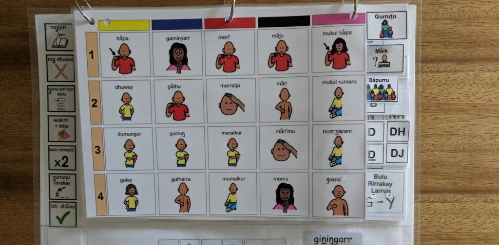 This is why Julie Gungunbuy, a Yolŋu researcher from Galiwin’ku community, and Balanda (non-First Nations) researcher Rebecca Amery have developed Yolŋu (Djambarrpuyŋu) alternative communication systems. Julie is the principal Yolŋu researcher working on the study exploring communication difficulties for Yolŋu living with MJD, a disease in her extended family.
