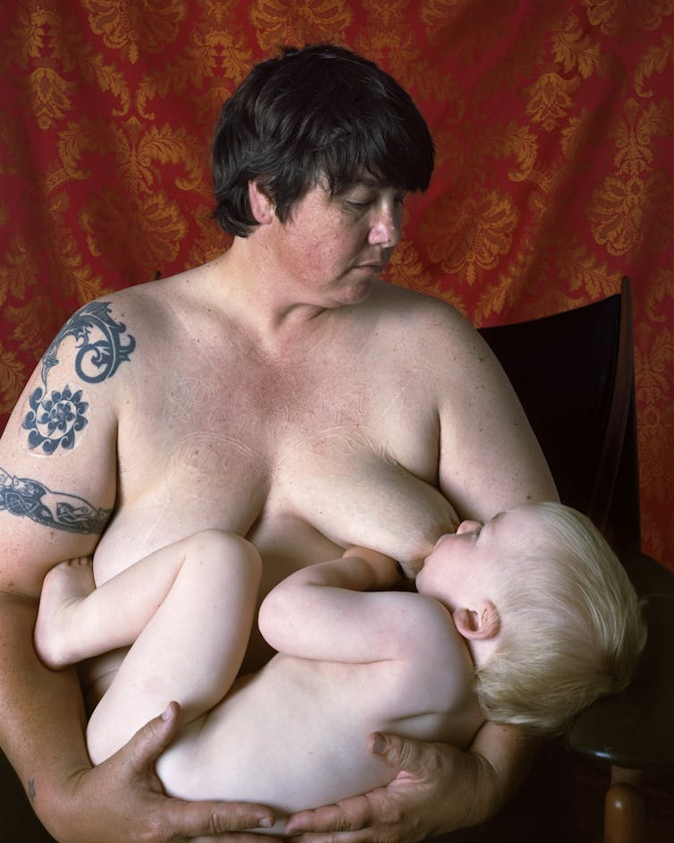 The next year we see her as Bo (1994), her mustachioed male alter-ego. Then, precisely ten years later, her familial longings are realised in the double portrait of Opie breastfeeding her immaculate son in Self-Portrait/Nursing (2004).