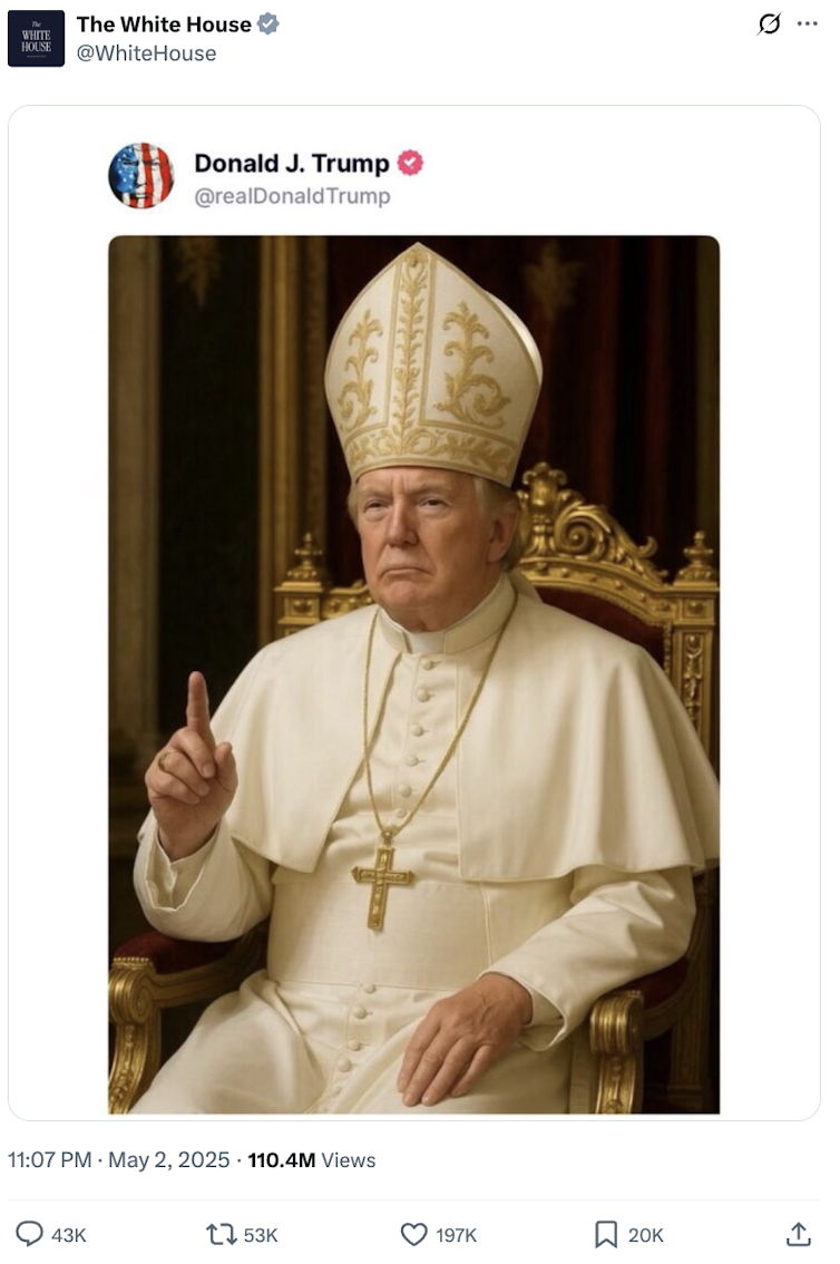 Days after Pope Francis’s death in April 2025, Trump posted an AI-generated image of himself in papal regalia on Truth Social. The White House’s official X account then shared it, amplifying its reach.