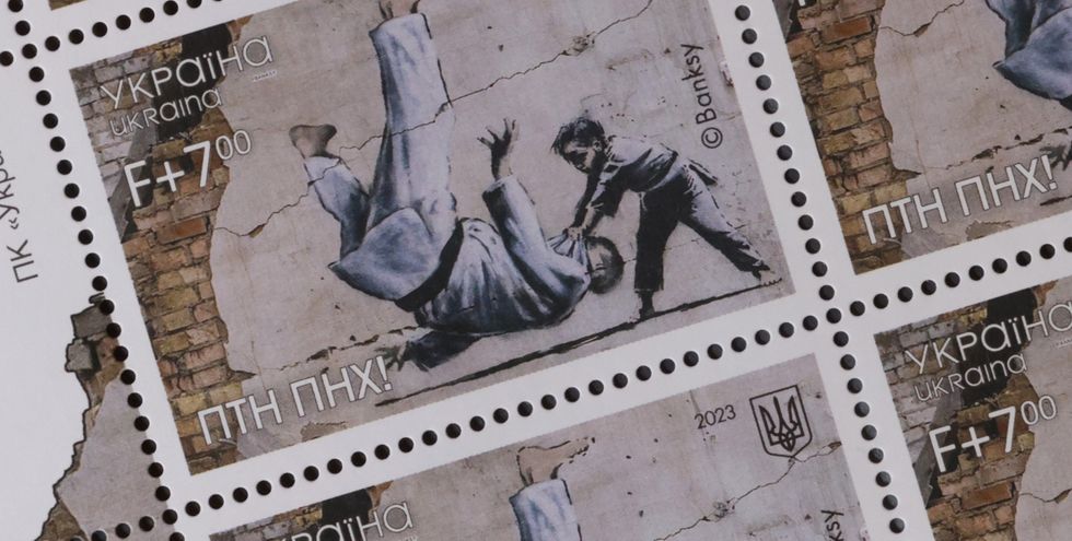 Again highlighting its tenacity, its resilience and its way with words, Ukraine marked last week’s grim anniversary of Russia’s invasion with a new postage stamp featuring an image from street artist Banksy’s recent visit there: A small boy deftly flipping to the ground a man in a judo match. In one lower corner are the words, in Cyrillic, “FCK PTN.” The “allegorical” image, says the post office, describes, “A year of resistance – painful, ragged, fierce, persistent,” but above all “Ukrainian.”