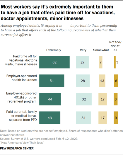 Regardless of whether their employer provides it, a majority of workers (62%) say it’s extremely important to them to have a job that offers paid time off for vacations, routine doctor’s appointments or to deal with minor illnesses. An additional 27% say this is very important to them.