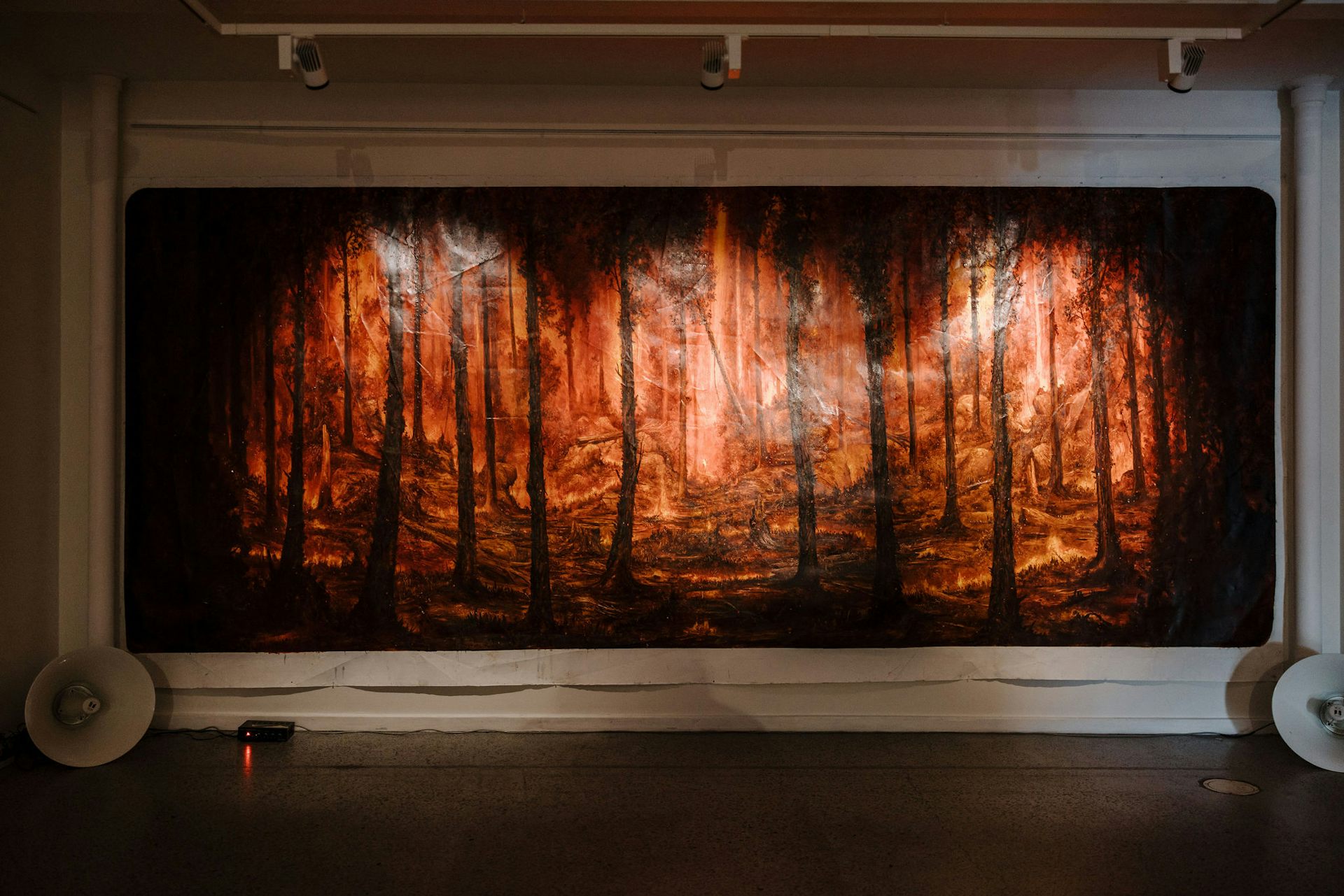 Peter Gardiner’s epic oil paintings depict the power of fire to both destroy and recreate, following his reading of the stories of survival from the royal commission transcripts.