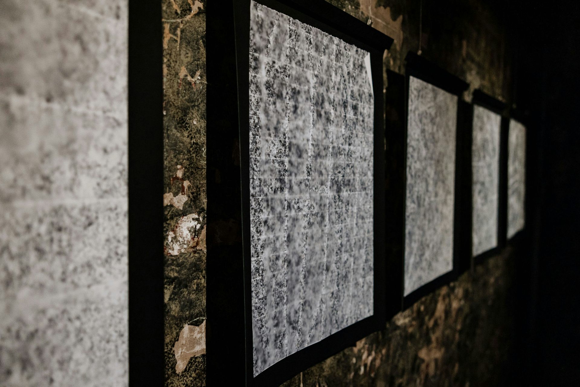 Clare Weeks invited survivors to take a piece of paper and imagine a word that reflected their sense of resilience and hope. Each piece of blank paper was folded and scanned, the surface revealing idiosyncratic features. Large images of these scans span the walls. We are invited to take our own square of paper and imagine our own response before placing it in a large glass bowl.