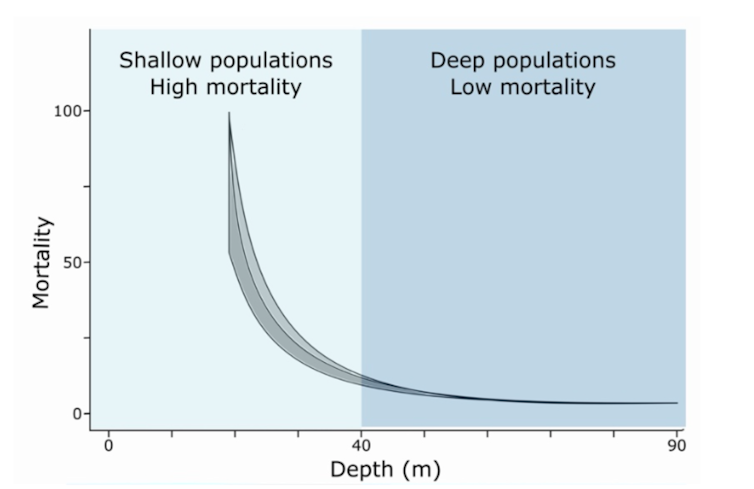 These findings confirm the “deep reef refugia” hypothesis, according to which marine populations residing at greater depths are less sensitive to the impacts of climate change, particularly with regard to rising sea surface temperatures.