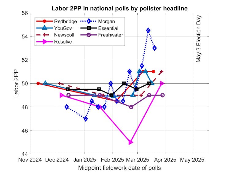 A national Resolve poll for Nine newspapers, conducted March 26–29 from a sample of 3,237 (double the usual sample size), had a 50–50 tie by respondent preferences, a five-point gain for Labor from the previous Resolve poll in late February, a pro-Coalition outlier.