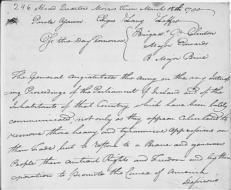 Cheers were raised for George Washington and “the American army,” but also for Irish patriots such as Henry Grattan and Henry Flood. “May the field pieces of Ireland bellow,” proclaimed one soldier, “till the nation is free.”