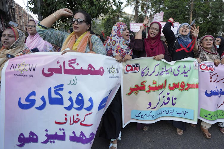 Members of Lady Health Workers’ union shout slogans during a rally to mark International Labour Day, in Karachi, Pakistan, May 1, 2023. Participants of the rally demand implementation of labour laws and increase in their wages.