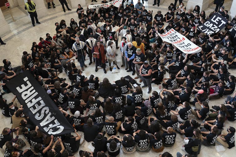 Demonstrators sit inside the Canon House office building in Washington, D.C. on Oct. 18, 2023, calling for an immediate ceasefire and for humanitarian assistance to be allowed to enter Gaza, during a sit-in.