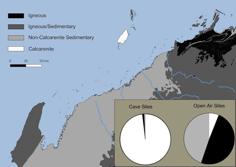 Barrow Island has a different rock composition from the mainland. Most artefacts from Boodie Cave were made from limestone, while most found in the open air were similar to materials from the mainland.