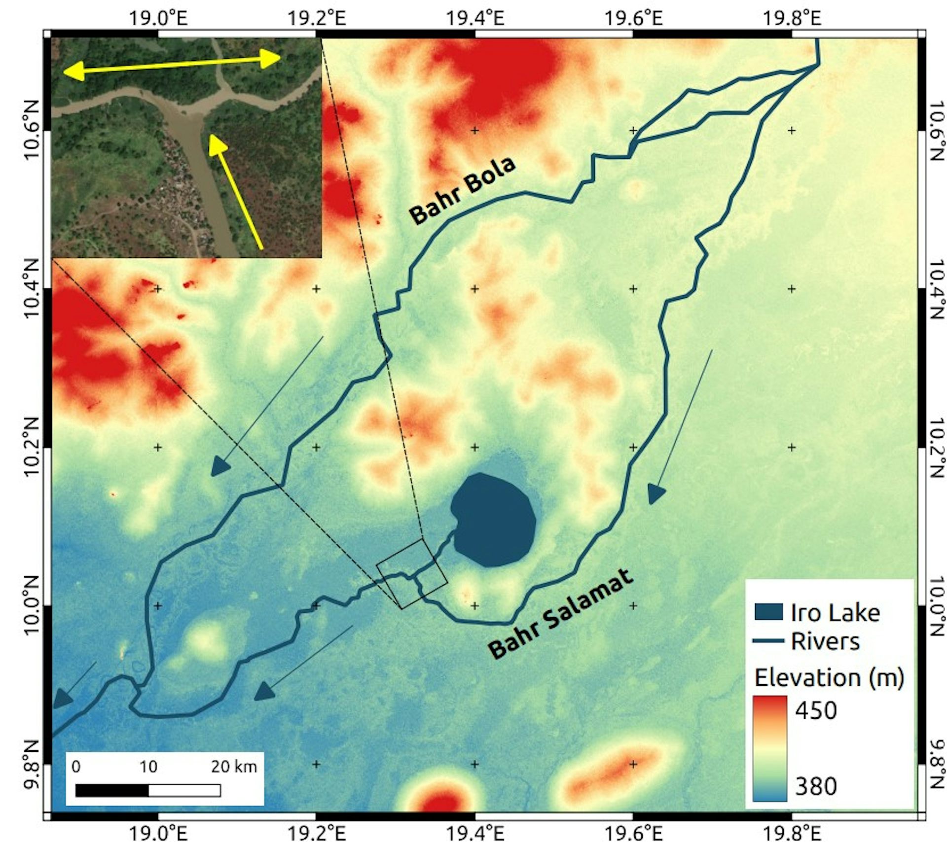 The area around Iro is extremely flat, as demonstrated by the slope of the Bahr Salamat river, south of the lake, of the order of 0.2 metres per kilometre. This explains the meandering nature of the river, highlighted by the published sunglint image.