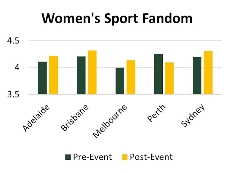 Our new research measured the impact of the 2023 FIFA Women’s World Cup on each Australian host city – Adelaide, Brisbane, Melbourne, Perth, and Sydney. Data collected from 2,000 Australians surveyed pre-event (June) and post-event (November) show the event increased Australians’ interest in women’s sport for all cities except Perth. In addition, each city showed greater support for hosting the event in the future, except Adelaide and Perth.