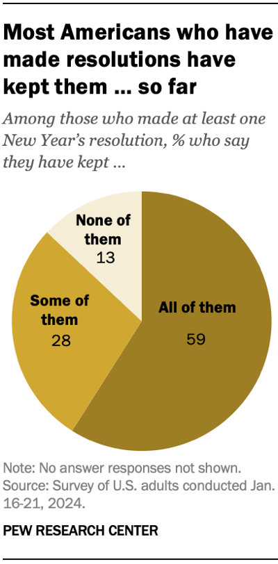 About six-in-ten adults who made at least one resolution (59%) say they have kept all of them so far, while 28% say they have kept some of them. Another 13% say they have kept none of them.