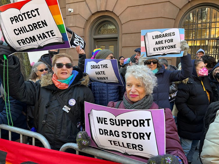 Supporters of drag queen story hour gather outside the Jackson Heights Queens Public Library in New York.